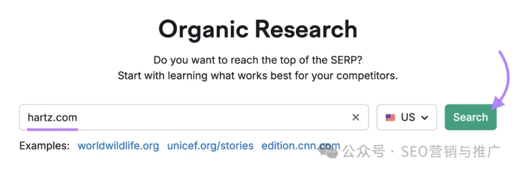 1)输入对手的网站域名;2)选择目标国家;3)点击「Search」即可。