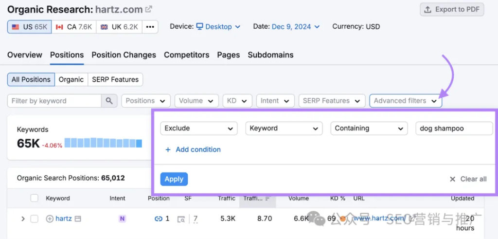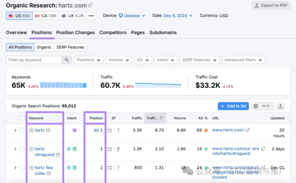 然后,进入“Positions”(排名)报告,即可查看该竞争对手的关键词排名。
