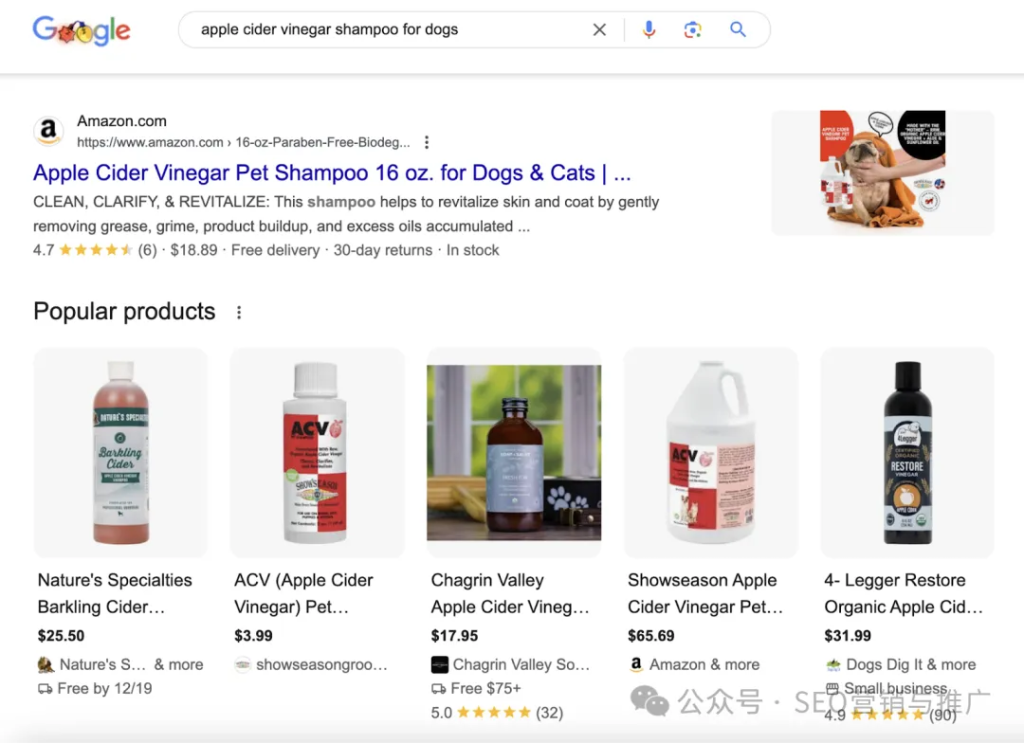比如对比 “apple cider vinegar for dog shampoo”(用于狗洗发水的苹果醋)和 “apple cider vinegar shampoo for dogs”(狗用苹果醋洗发水)。