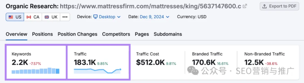 根据 Semrush 的 Organic Research 工具数据显示,它目前覆盖了大约 2,200 个关键词,每个月大约能从美国获得 183,100 次自然流量。