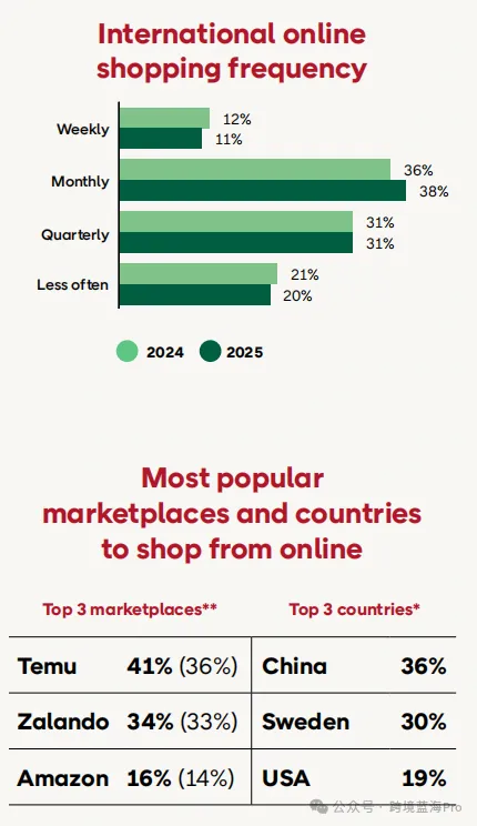 整个北欧市场跨境购物占比极高,83%的消费者每月至少网购一次,其中约70%有跨境购物行为。在这种环境下,Temu的“全托管+低价直达”模式恰好契合了市场痛点:一方面满足了价格敏感型用户的需求,另一方面也简化了购物流程,降低了选择成本。