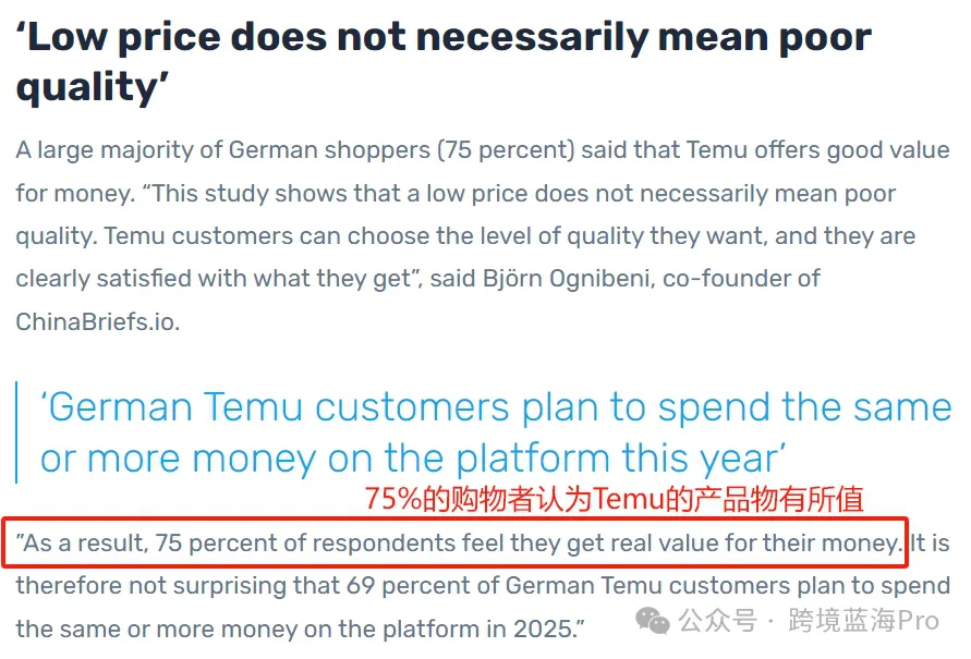 益普索联合Temu对3000名英、德、法、西网上购物者调研表明:德国有75%受访者认为其产品“物有所值”。
