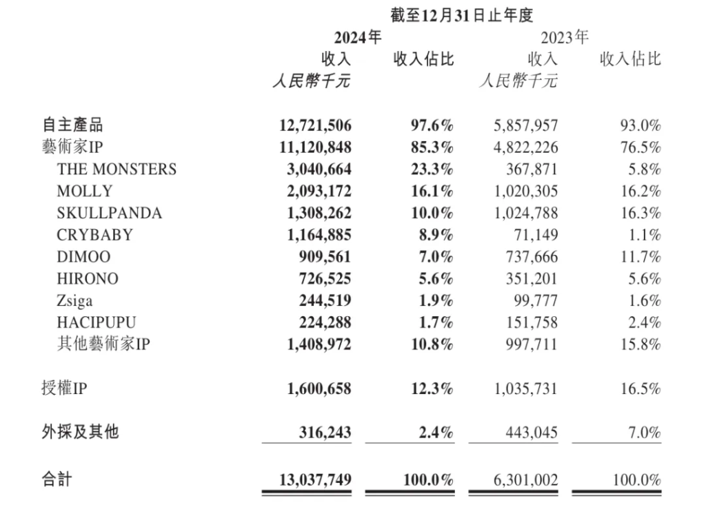 海外市场成为了泡泡玛特业绩增长的“最强动力”,而Labubu则是最为重要的“助燃剂”。尽管泡泡玛特Q1财报并未公布IP收入占比,但从其2024年财报来看,THE MONSTERS系列已凭借「Labubu」异军突起,实现30.4亿的营收,占总收入比为23.3%。