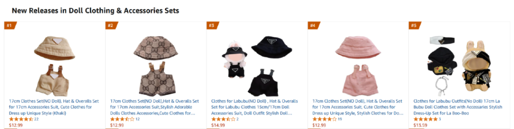 其中,最热销的类目为Labubu相关服饰套装。NIUNIUCard观察到,在亚马逊“Doll Clothing & Accessories Sets”的新品热销榜上,销量排名前五的产品均为符合Labubu尺寸(或产品图片直接使用Labubu为“模特”)的服饰产品。其中榜首的“工作服”上月销量已过千。