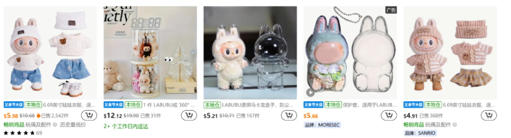 而随着Labubu的知名度逐渐提高,其相关周边产品热度同样水涨船高。在速卖通之外,不少跨境卖家也已凭借Labubu相关周边产品实现销量翻番。