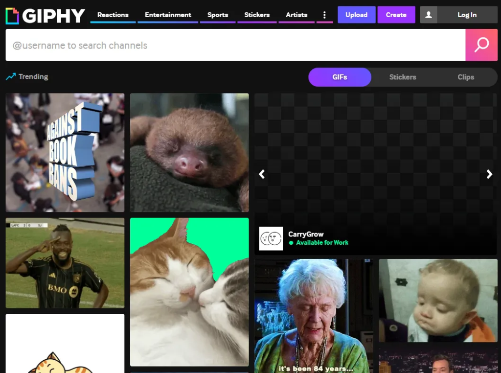 这是一个最好的寻找动图素材的地方。今年被facebook收购。我们可以在 GIPHY 创作、上传动图。为了方便用户使用 GIPHY 的动图,Facebook、WhatsApp、iMessage、TikTok、Skype、Twitter、Tinder 等应用都调用了 GIPHY 的应用接口。
